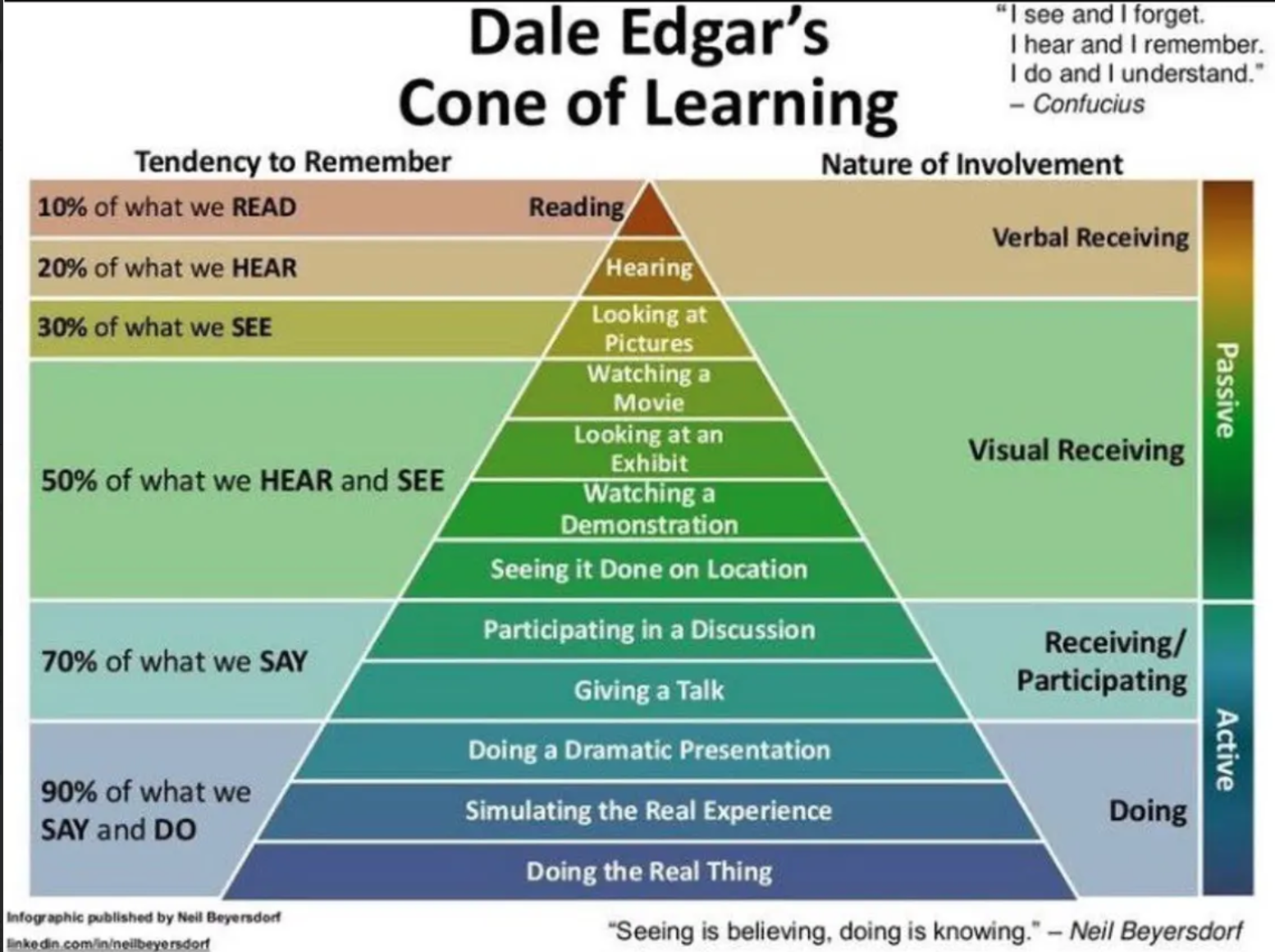 Active learning is student-centered as students take more responsibility for their own learning; the teacher, in turn, assumes the role as facilitator, guide, coach. Active learning often encompasses discovery learning, problem-based learning or inquiry based learning. Students learn by doing rather than by lecture. Research about active learning found higher levels of student achievement and personal development, increased course grades, and increased student motivation (Cavenagh 2016; Freeman et al., 2014; Kuh, O’Donnell, Schneider, 2017; Owens, Sadler, Barlow & Smith Walters, 2017). A look at Dale Edgar’s Cone of Learning indicates that active learning leads to higher levels of retention compared to passive learning such as lectures or watching a video.