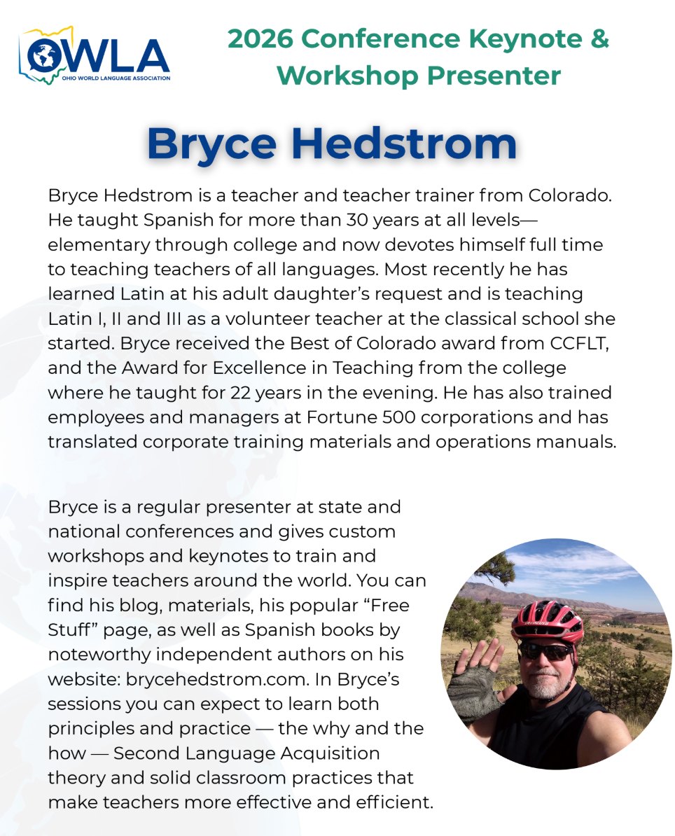 Please register for our next professional development opportunity on Saturday, October 18, 2025, at Buckeye Valley High School in Delaware, OH. We will offer our OWLA Fall Workshops: Real Language, Real Connections, featuring our own Professional Development Chair, Alexis Blum, who is presenting during Session 1: Building Intercultural Communication Skills Using Authentic Resources (Central States Extension Workshop) based on the workshop offered by Lesley Grahn at Central States 2025. We are also pleased to have Melissa Dalton, Michigan World Language Association President-Elect, presenting Session 2: Proficiency “Glow Up”: Building Competency in Lesson Planning for the Next Generation.